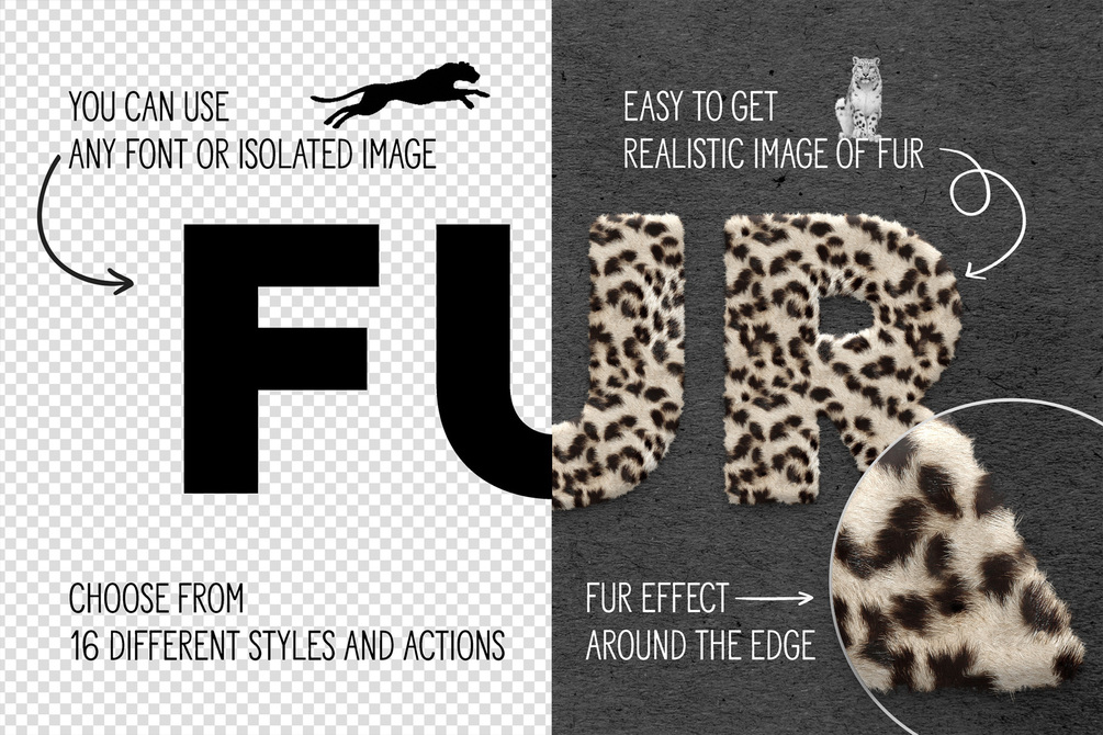 It works with text and graphics. But keep in mind that the fur is fluffy and the image should not be small or have many small details. You can also use brushes separately and add fun fur elements on the fur layer. Create a logo, lettering, greeting cards, web and print design, business card or invitation, images and so much more. Experiment with color and these styles in your creative projects!